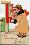 Mfg. Unknown Printed in Germany Circa: 1930's - 1940's Mechanical Cut-Out Card. Move the red heart and the woman's arm moves and puts a coin into a subway fortune telling machine. Her fortune then appears out of the slot and reads: "You Big Boloney. Card reads: My Love ~ Subway ~ Your Fortune 1¢ ~ Valentine's Secrets". The back has a tab that allows the card to stand on its own. |