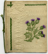 ![]() Mfg. Unknown Copyright 304 Circa: Late 1800's - Early 1900's Embossed, Celluloid Card is both Stitched and held together by a green ribbon. The Celluloid cover is Embossed and painted reading: "For Auld Lang Syne". The inside reads: "No Joy this Christmas may you not miss" ~ From ~ To ~ "As year by year through life we glide - Two things at least are well worth while: - To look upon its brightest side, And learn to cultivate a smile." |